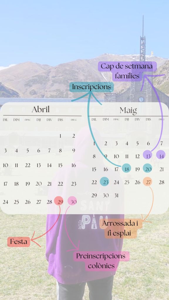 – Fins diumenge 30 d’abril: PREINSCRIPCIONS ACTIVITATS D’ESTIU (https://esplaisantpaugirona.com/2023/04/05/ja-arriben-les-activitats-destiu-2023-%e2%98%80%ef%b8%8f/)