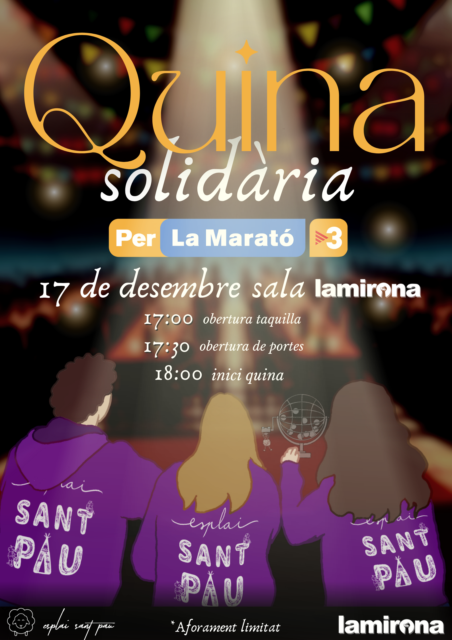 Un any més arriba el vostre dia preferit de l’any!! Ni tió, ni dinars familiars ni sopar de cap d’any, ni nadal! Arriba de nou…. la QUINA SOLIDÀRIA per LA MARATÓ DE TV3 organitzada per l’ESPLAI ST PAU!!!